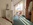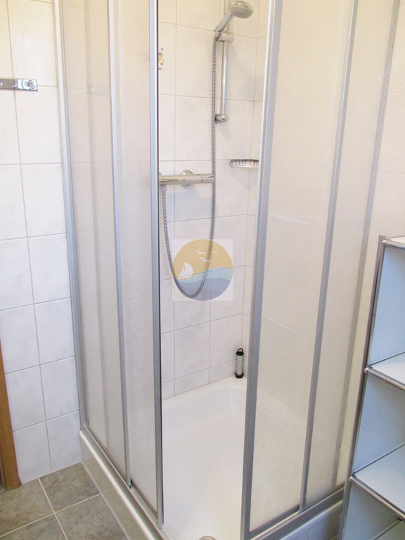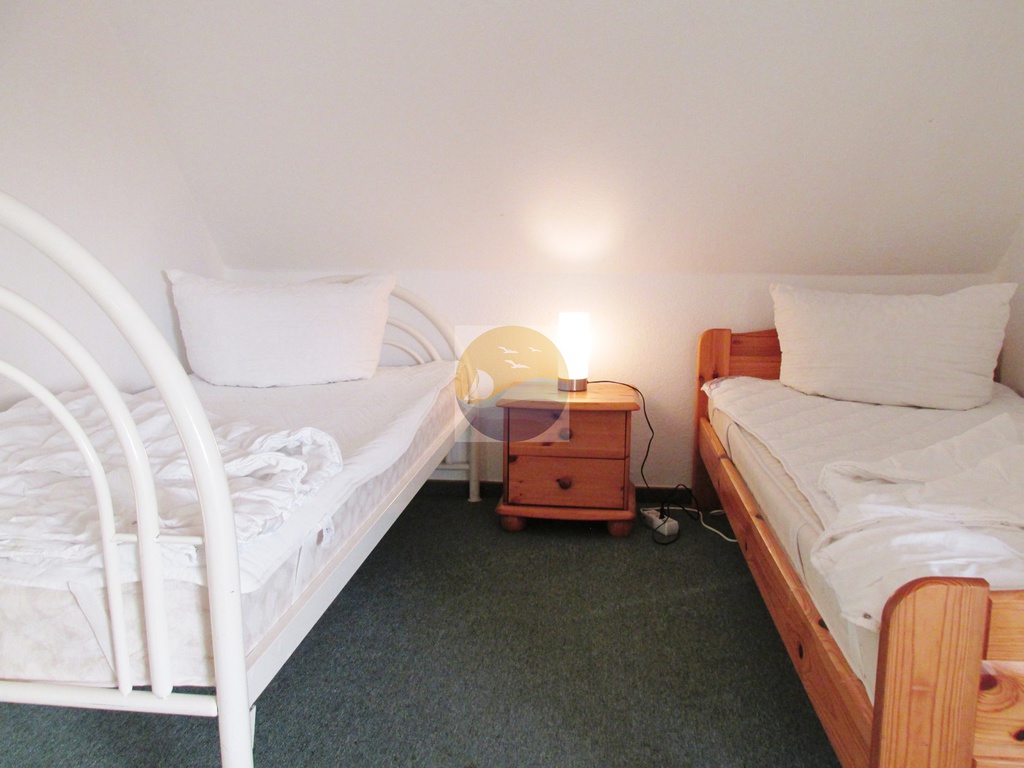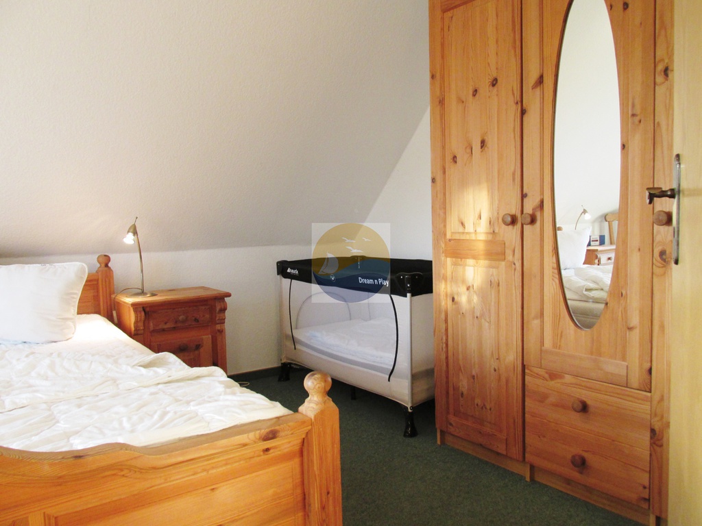 Im Obergeschoss warten zwei Schlafzimmer: eines mit Doppelbett, zusätzlichem TV-Gerät und Kinderbett, das zweite mit zwei Einzelbetten und kleiner Sitzecke. Direkt daneben liegt das Badezimmer mit Dusche und WC.