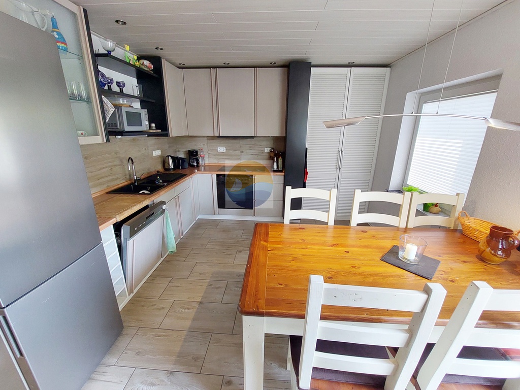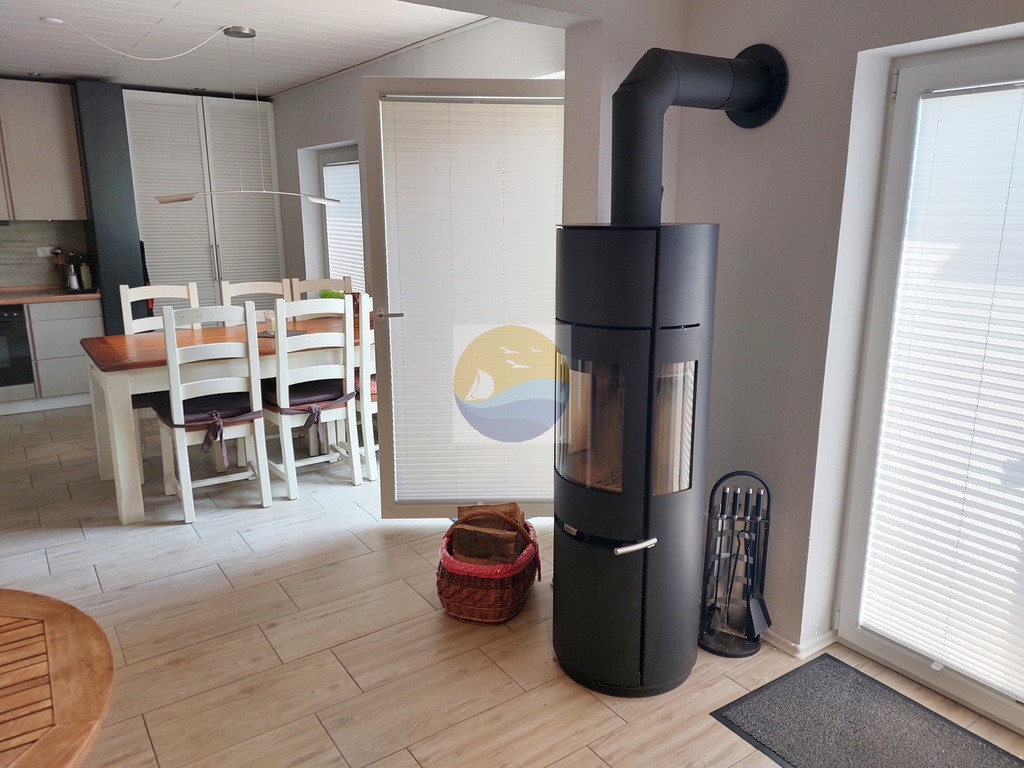 Herzlich willkommen in unserem Ferienhaus Nordliebe in Nesse. Vom hellen Eingangsbereich gelangen Sie in den kombinierten Wohn- und Essbereich. Die Küche ist praktisch ausgestattet mit Backofen, Mikrowelle, Filterkaffeemaschine und Kühl-/Gefrierkombination; ein großer Esstisch lädt zu gemeinsamen Mahlzeiten ein. Auf der großzügigen, gemütlichen Couch findet die ganze Familie Platz für entspannte TV- oder Spieleabende. Ein Kamin sorgt für zusätzliche Wohlfühlatmosphäre. Vom Wohnbereich aus haben Sie Zugang zur Terrasse.