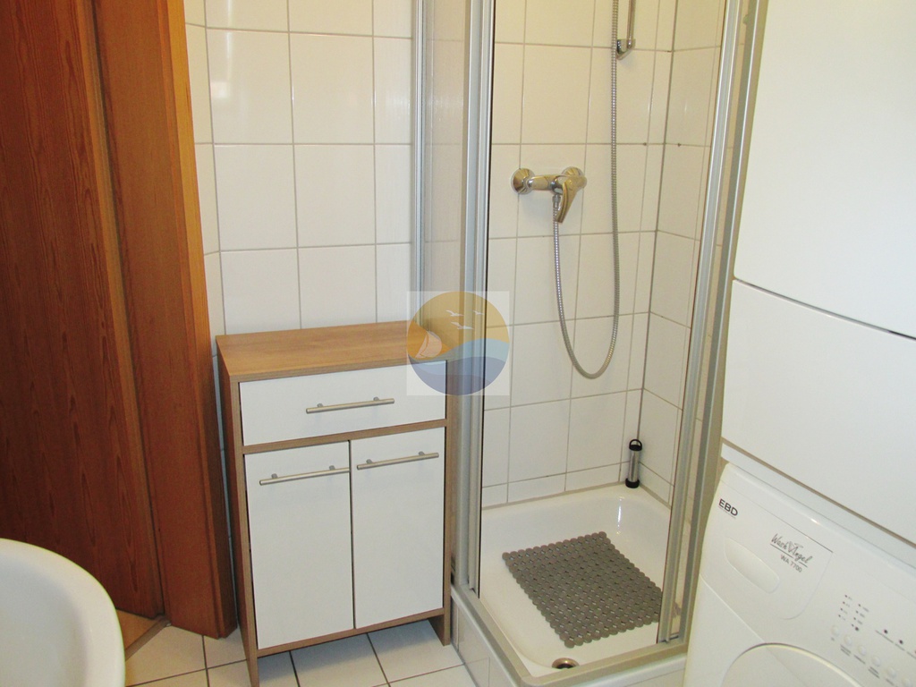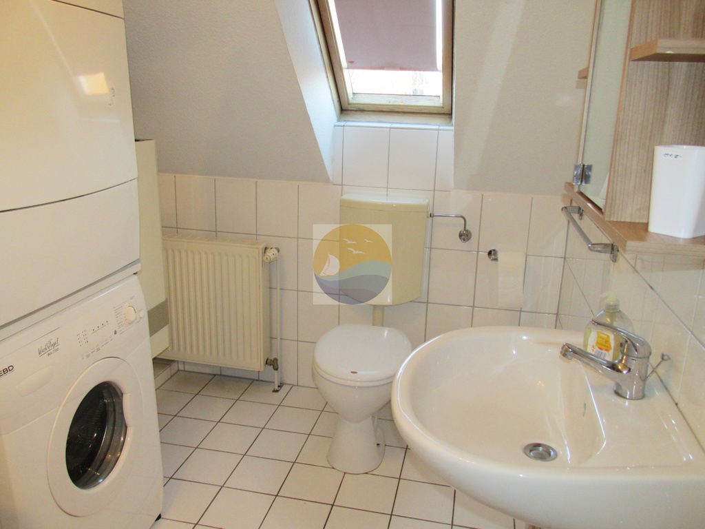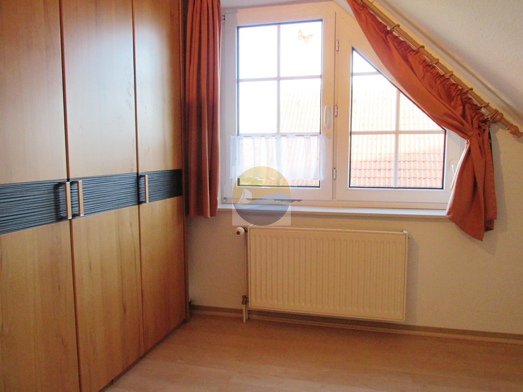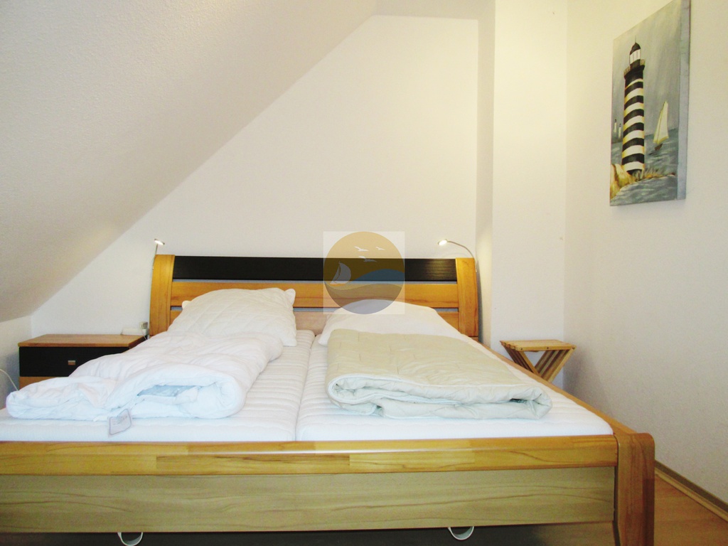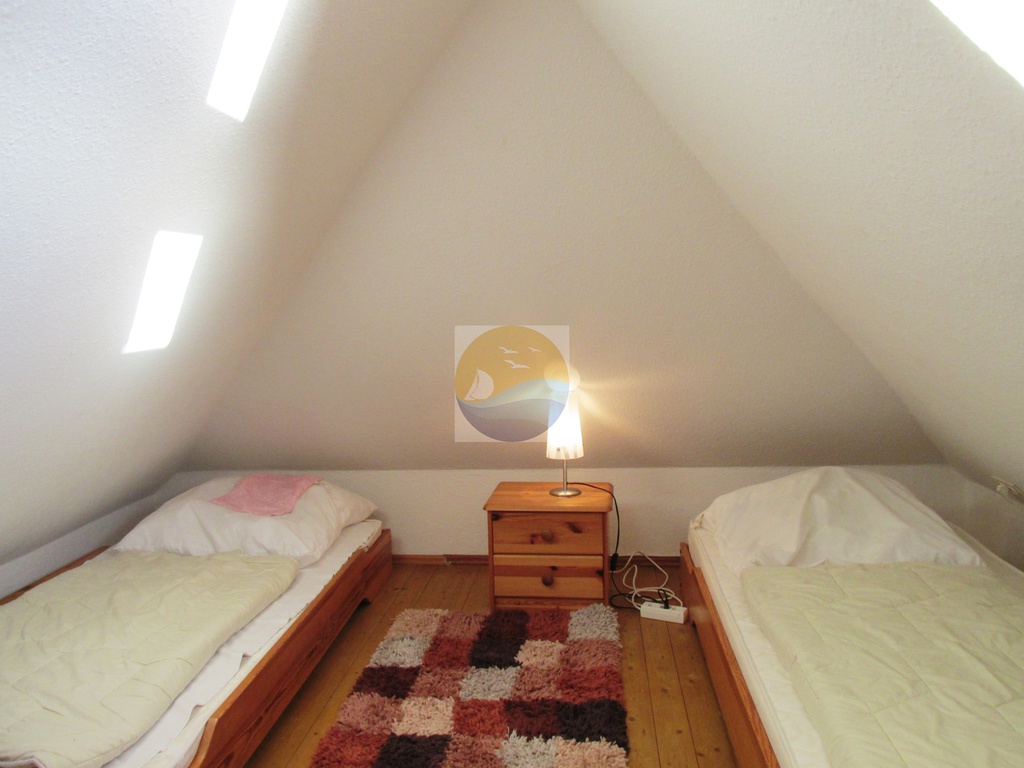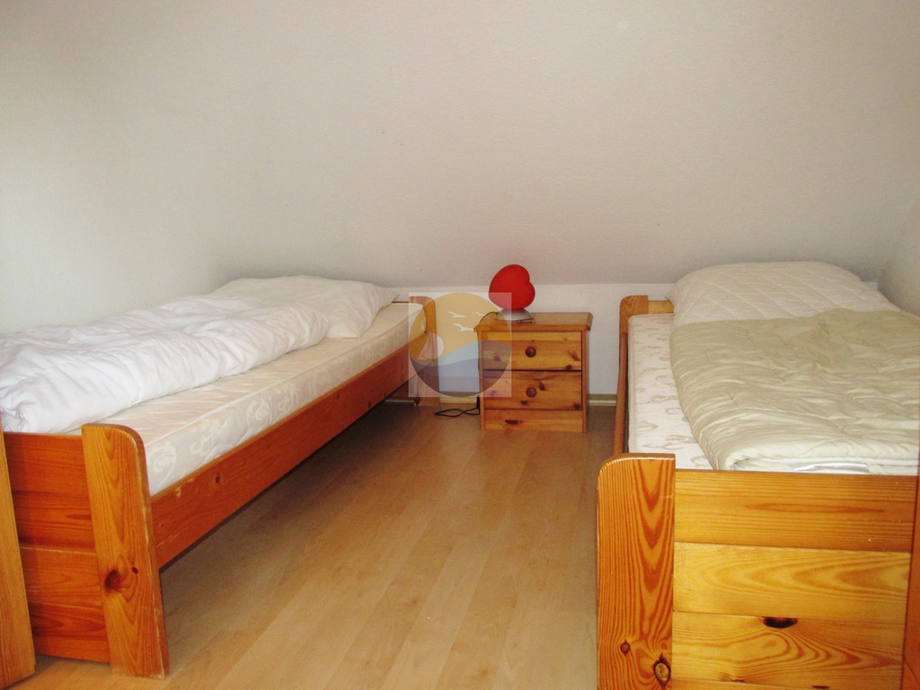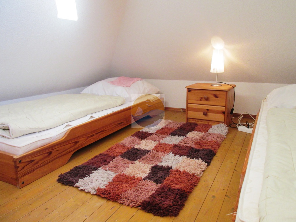 Im Obergeschoss stehen Ihnen zwei Schlafzimmer zur Verfügung: eines mit Doppelbett, das andere mit zwei Einzelbetten und einer Kinderspielecke. An der Treppe sorgt ein Treppenschutzgitter für Sicherheit. Das Badezimmer ist mit Dusche, WC und beleuchtetem Spiegelschrank ausgestattet. Waschmaschine und Trockner sind hier ebenfalls untergebracht. Im Dachgeschoss erwartet Sie ein offener Schlafraum mit zwei weiteren Einzelbetten.
