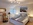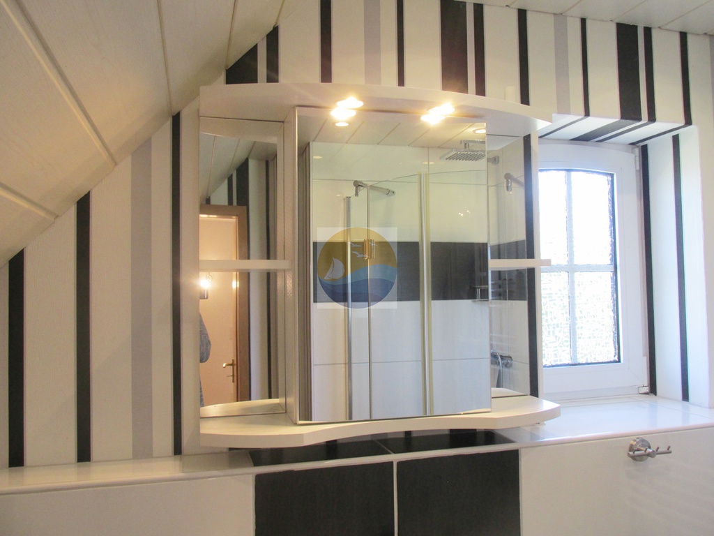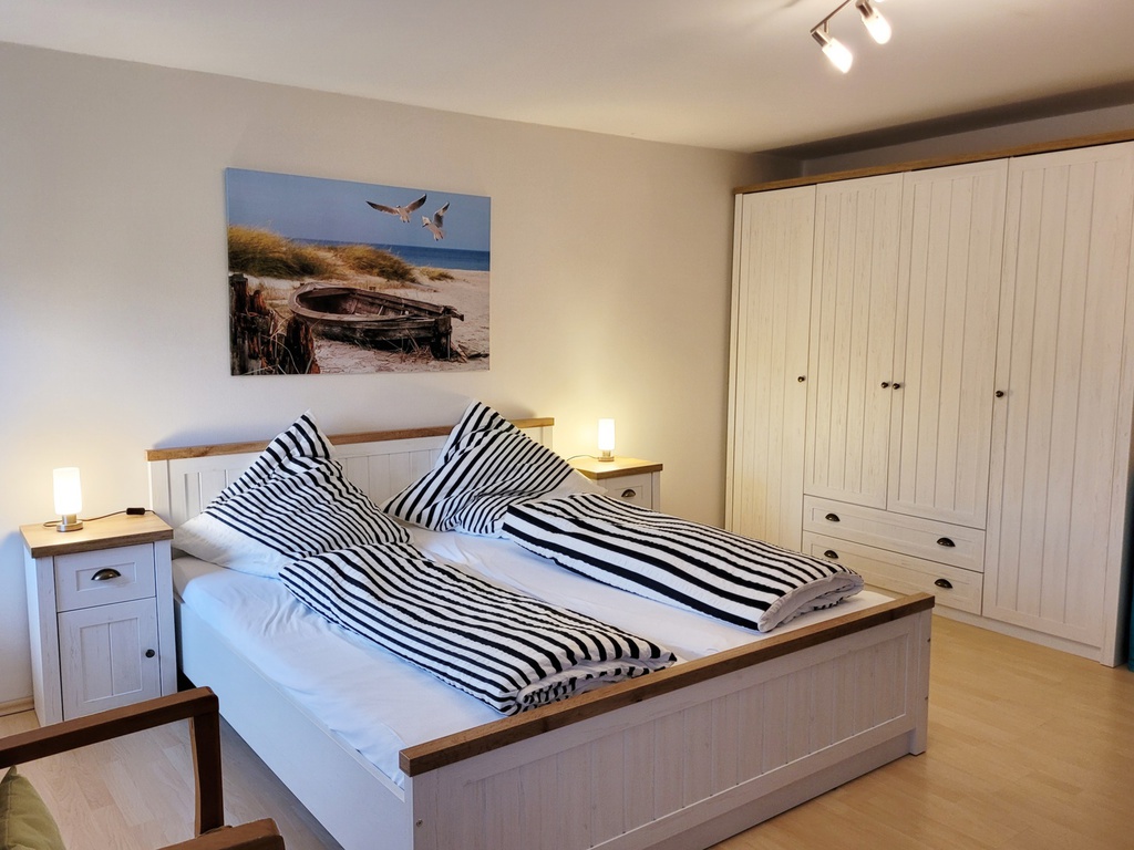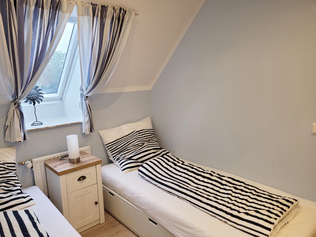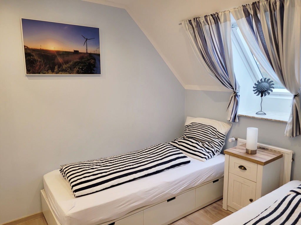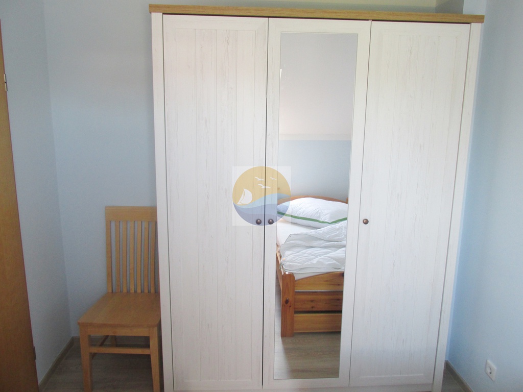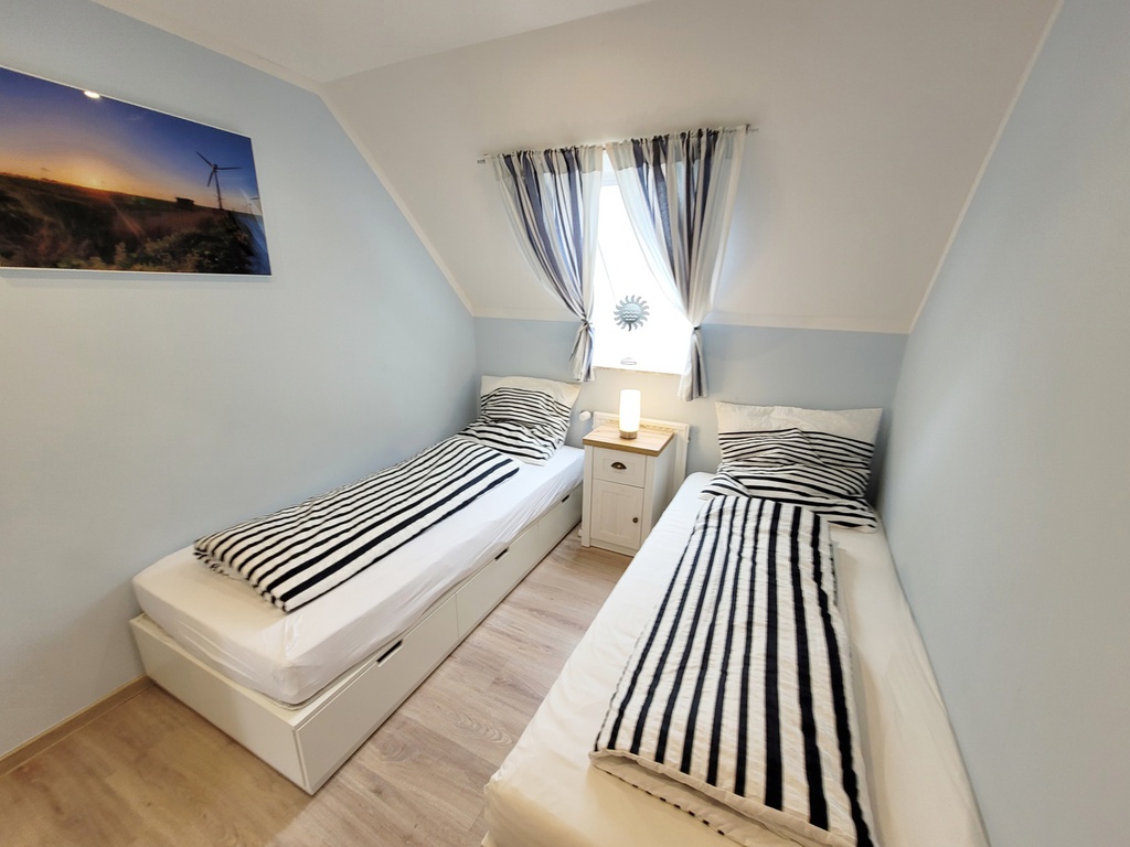 Über die Steintreppe erreichen Sie das Obergeschoss. Im Masterroom-Schlafzimmer erwartet Sie ein komfortables Doppelbett, ein Kleiderschrank und ein TV-Gerät. Ein besonderes Highlight ist die Fototapete mit Strandmotiv – hier wachen Sie gefühlt direkt am Meer auf. Das zweite Schlafzimmer verfügt über zwei Einzelbetten. Alle Betten im Haus sind mit spezieller Allergikerwäsche ausgestattet, an den Fenstern sind Fliegengitter angebracht. Das Badezimmer im Obergeschoss bietet eine moderne Regendusche sowie ein weiteres WC.