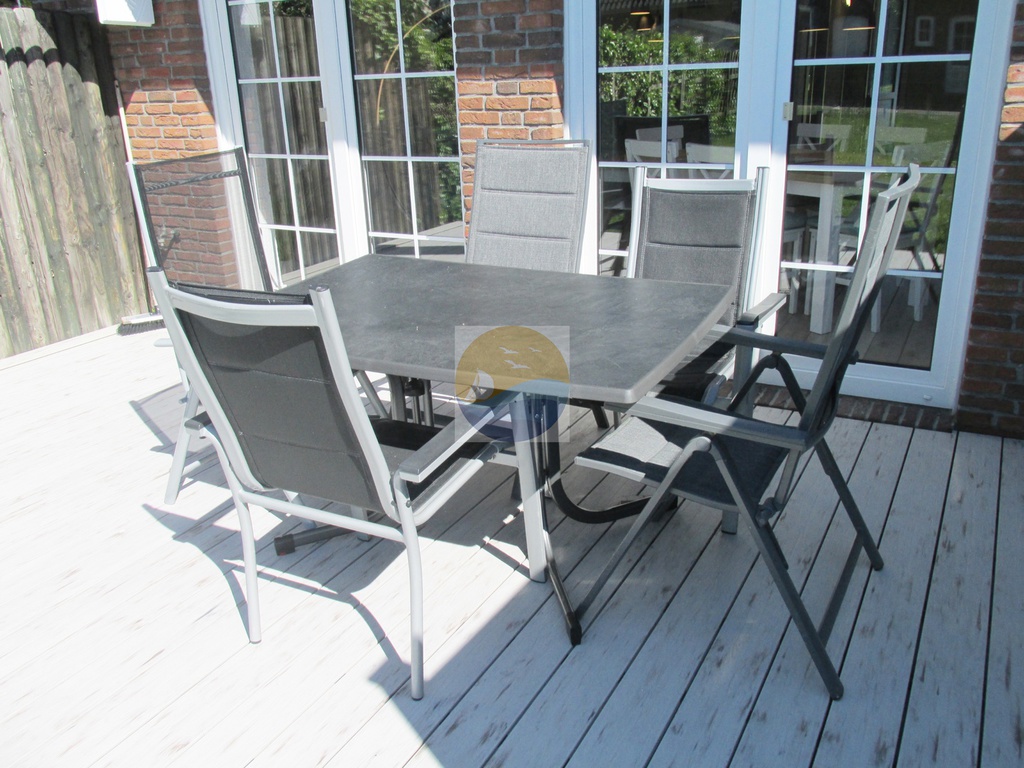 Im Erdgeschoss befindet sich die moderne Küche mit Backofen, Mikrowelle, Spülmaschine sowie Kaffee- und Teemaschine. Der kombinierte Wohn- und Essbereich mit großer Couchgarnitur und Esstisch lädt zum Verweilen ein. Von hier aus gelangen Sie direkt auf die möblierte Terrasse mit Sonnenschirm sowie in den Garten. Ein Gäste-WC mit Waschmaschine rundet die untere Etage ab.