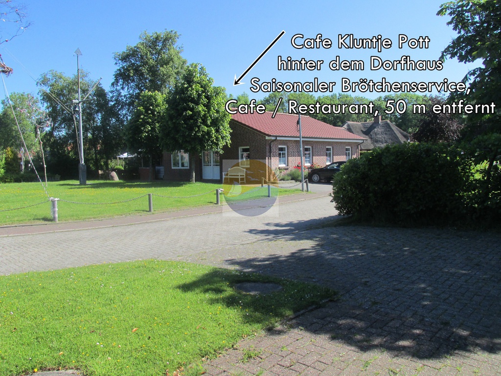 WLAN ist vorhanden (bedingt) und für Fahrräder steht eine Garage für bis zu 4 Räder zur Verfügung. Nur wenige Meter vom Haus entfernt liegt das Café Kluntje Pott, das – je nach Saison – Brötchenservice, Kaffee, Tee, Kuchen und kleine Mahlzeiten anbietet. Am Haus stehen 2 Autostellplätze sowie ein öffentlicher Fahrradabstellplatz zur Verfügung.