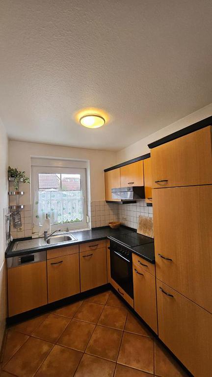 Im Erdgeschoss gelangen Sie durch den Eingangsflur, von dem ein Gäste-WC abgeht, in den hellen Wohn- und Essbereich. Terracottafarbene Fliesen und eine bequeme rote Couchgarnitur sorgen sofort für Gemütlichkeit. Die Essecke mit großen Erkerfenstern lädt zu langen gemeinsamen Mahlzeiten ein, die Sie in der gut ausgestatteten Küche zubereiten können.