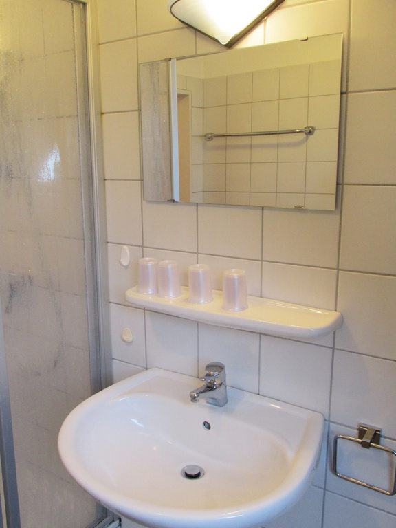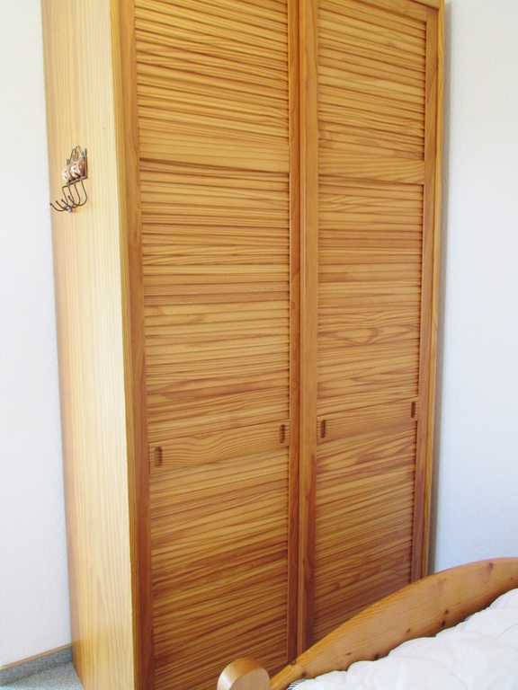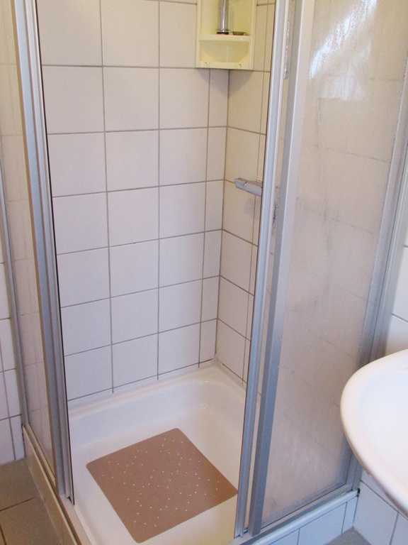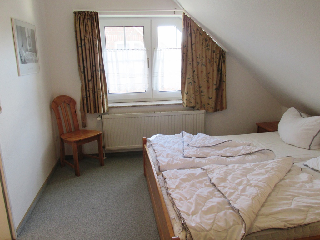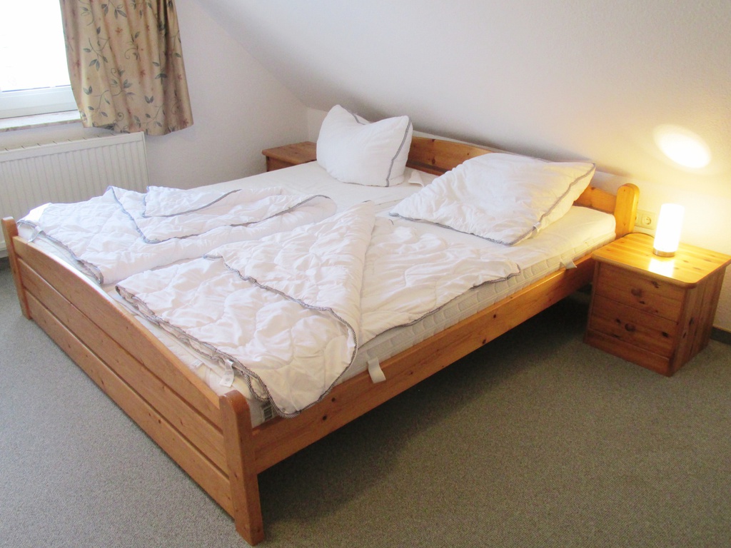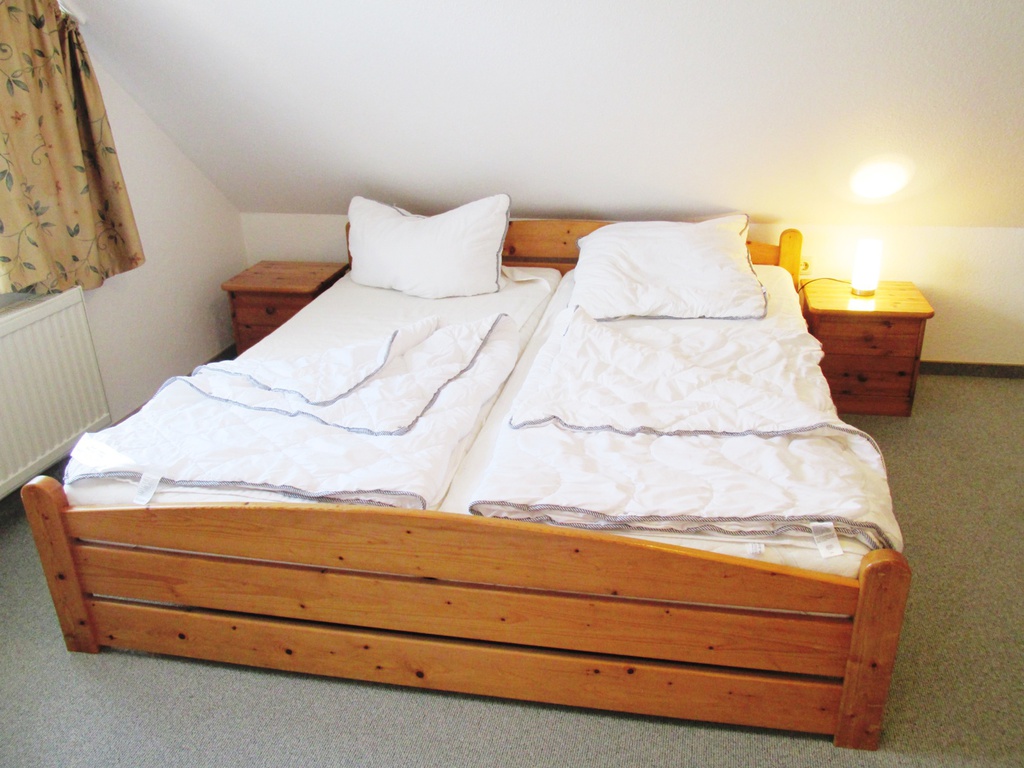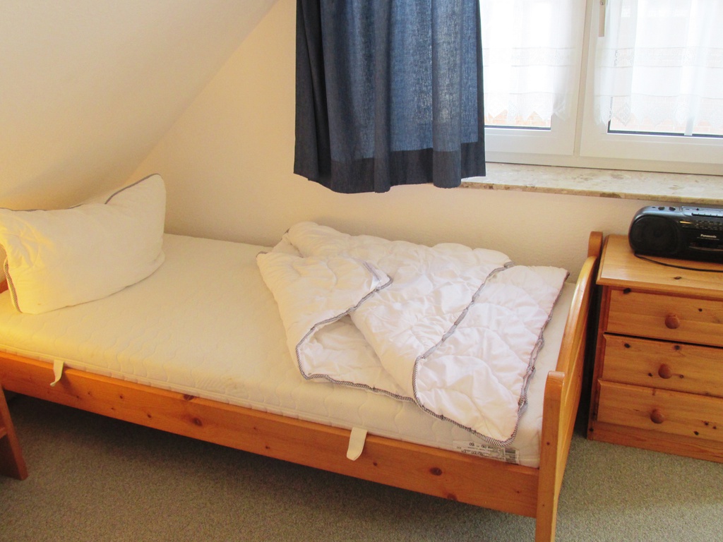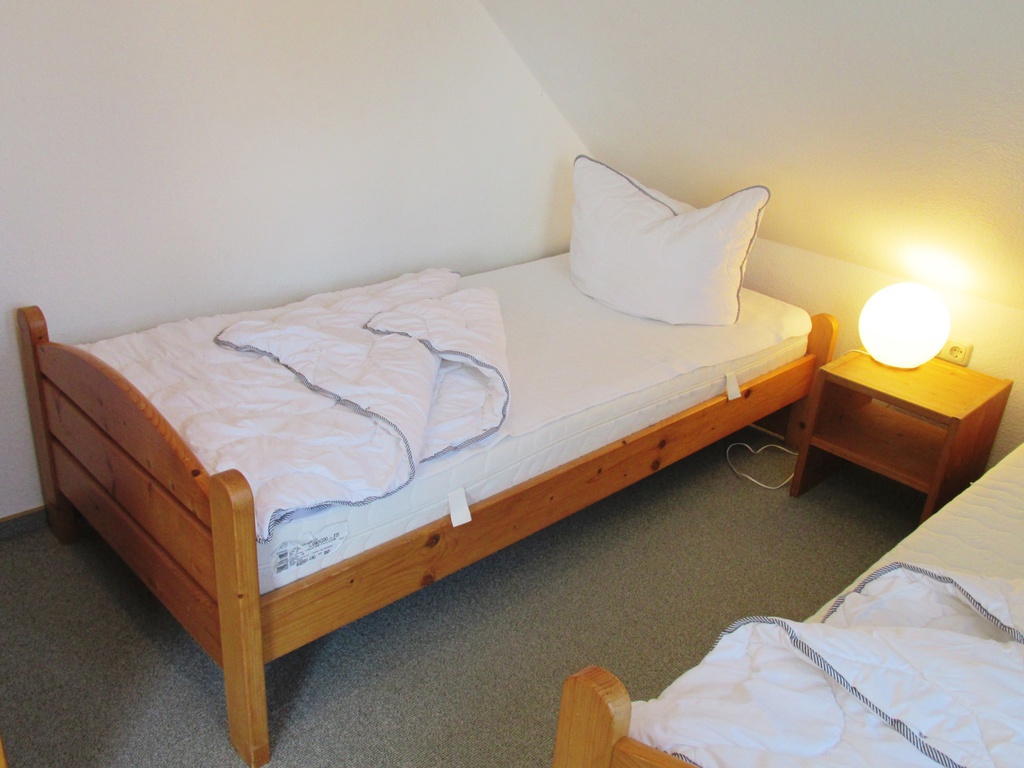 Im Obergeschoss erwarten Sie zwei Schlafzimmer: eines mit Doppelbett, das andere mit zwei Einzelbetten. Das Badezimmer ist mit Dusche und WC ausgestattet.