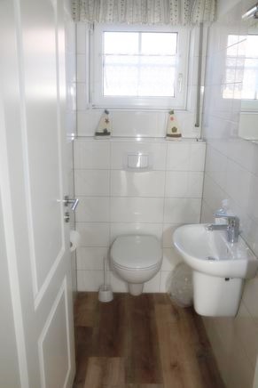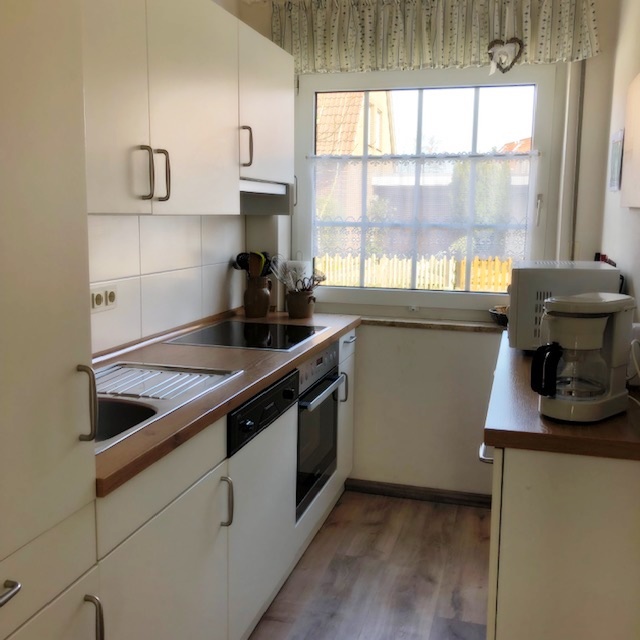 Im Erdgeschoss gelangen Sie in den Wohn- und Essbereich, ausgestattet mit Sofa, zwei Sesseln, Esstisch und TV-Gerät. Die Küche ist vollständig eingerichtet und bietet alle erforderlichen Geräte für Ihren Aufenthalt, inklusive Spülmaschine, Backofen, Mikrowelle, Gefrierfach, Kaffeemaschine, Senseo, Toaster, Wasserkocher, Eierkocher und elektrische Saftpresse. Ein Gäste-WC befindet sich ebenfalls im Erdgeschoss.