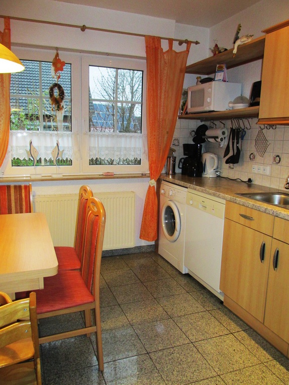 Küche mit Spülmaschine, Kaffeemaschine, Wasserkocher, Toaster, Mikrowelle, Gefrierfach, Eierkocher