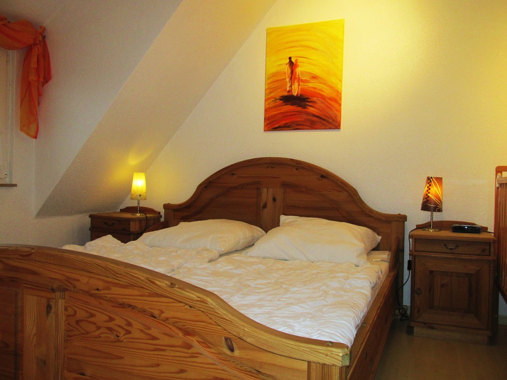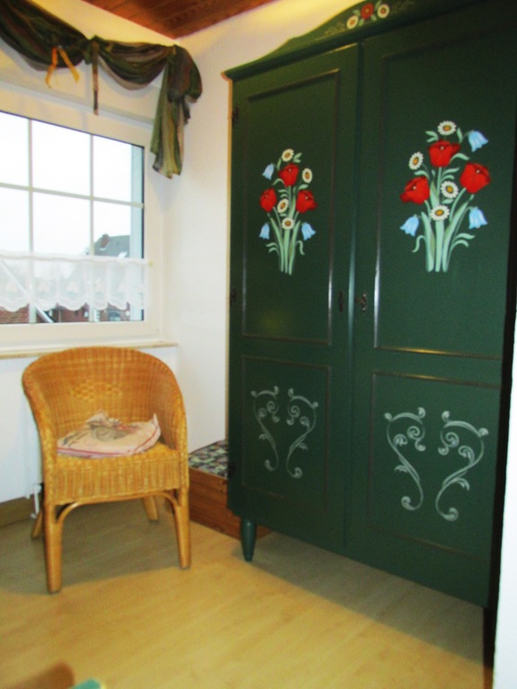 Im Obergeschoss erwarten Sie zwei weitere Schlafzimmer: ein Zimmer mit Doppelbett sowie ein liebevoll dekoriertes Kinderzimmer mit Einzelbett und besonderen Möbeln. Zusätzlich gibt es ein Gäste-WC sowie einen kleinen Abstellraum.