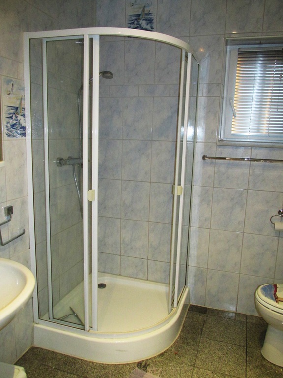 Ein besonderes Highlight ist das große Badezimmer, ausgestattet mit Dusche und Badewanne. Zudem befindet sich im Erdgeschoss ein Schlafzimmer mit Doppelbett und Kinderbett.
