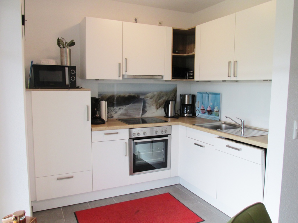 Im lichtdurchfluteten Wohn- und Essbereich erwartet Sie eine voll ausgestattete, moderne Küche, die nicht nur durch ihr elegantes Erscheinungsbild besticht, sondern auch durch ihre durchdachte Ausstattung. Vom sorgfältig ausgewählten Geschirr bis hin zu hochwertigem Besteck – hier wurde an alles gedacht, damit Sie Ihren Aufenthalt in vollen Zügen genießen können.