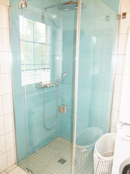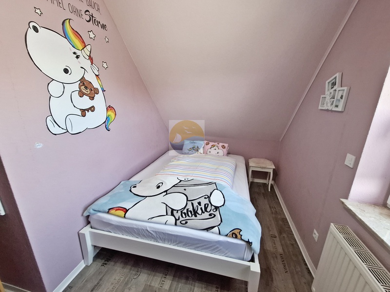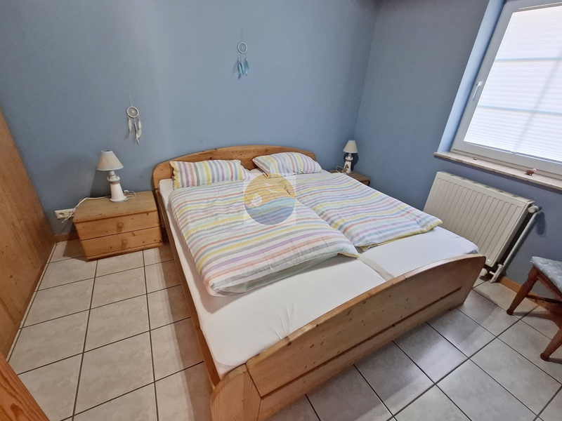 Ebenfalls im Erdgeschoss befinden sich ein freundlich eingerichtetes Schlafzimmer mit Doppelbett, ein Badezimmer mit ebenerdiger Dusche und WC, sowie Waschmaschine, Trockner und ein Abstellraum.