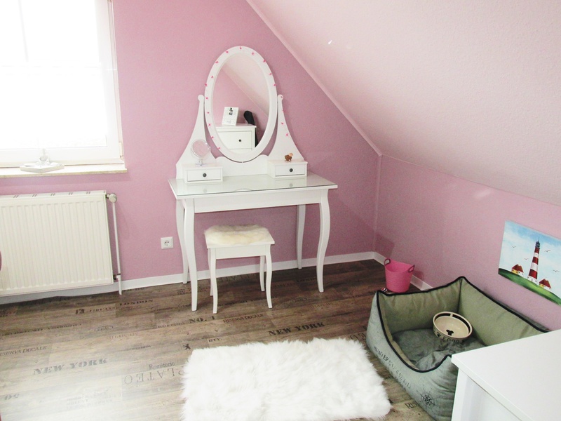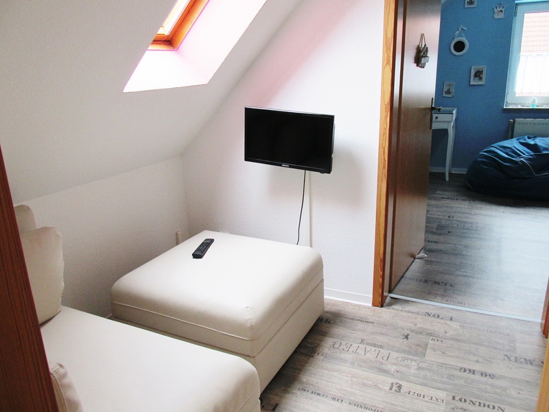 Im Obergeschoss finden Sie zwei weitere Schlafzimmer: eines mit Doppelbett, Hundekörben, großer Transportbox und eigenem Fernseher, das zweite mit einem 1,40 m breiten Bett und Schminktisch. Zudem gibt es im Flur eine kleine Sitzecke mit TV. Abgerundet wird die obere Etage durch ein Badezimmer mit Badewanne.