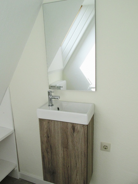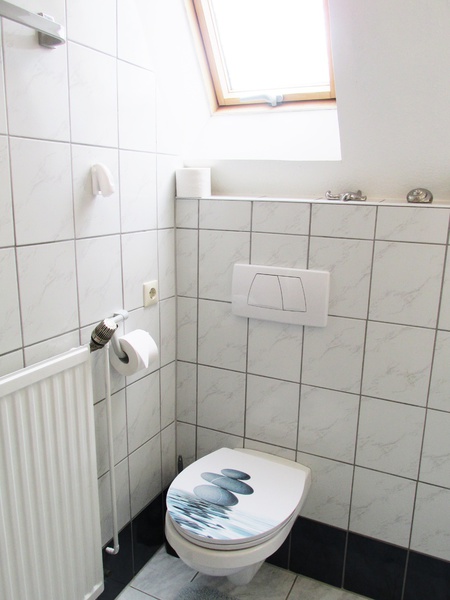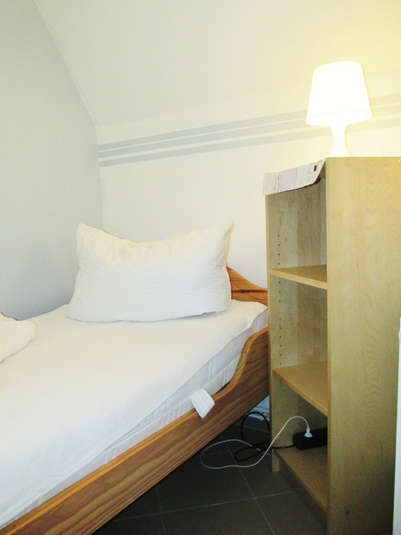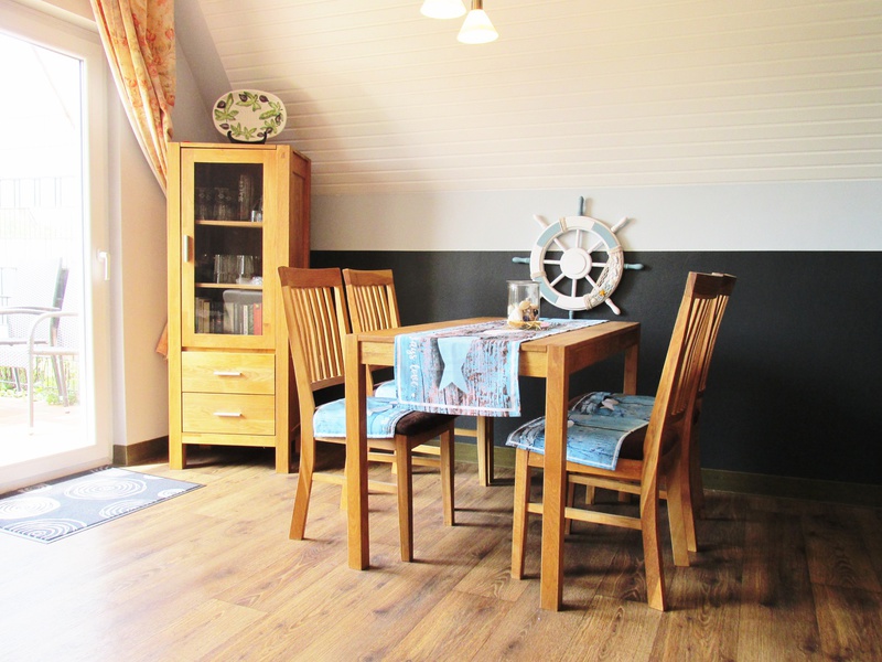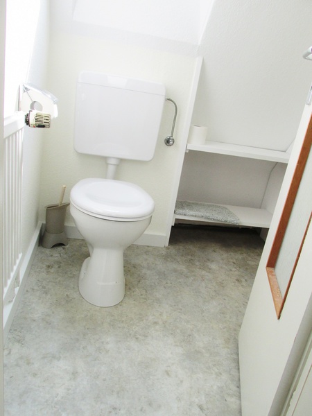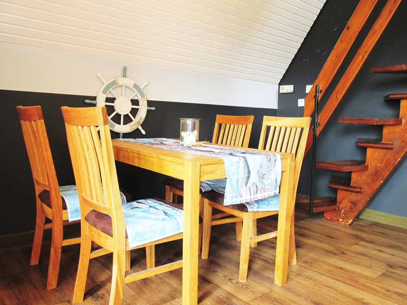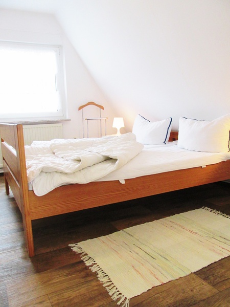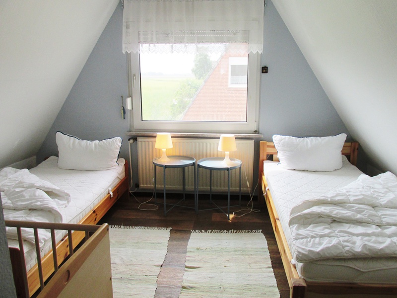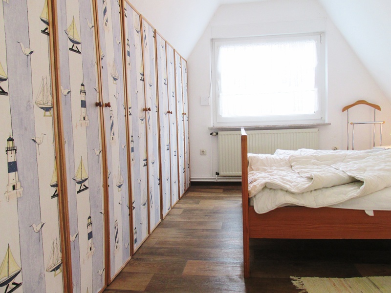 Im Obergeschoss befinden sich die Schlafzimmer: ein Doppelzimmer mit großem, maritimem Kleiderschrank und ein zweites Zimmer mit zwei Einzelbetten und Regal. Zusätzlich gibt es ein Gäste-WC. Für die kleinen Gäste stehen Kinderbett und Hochstuhl bereit.