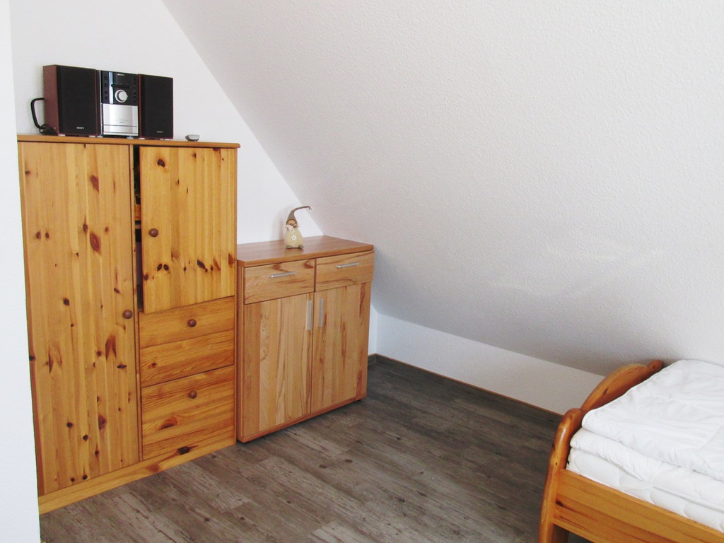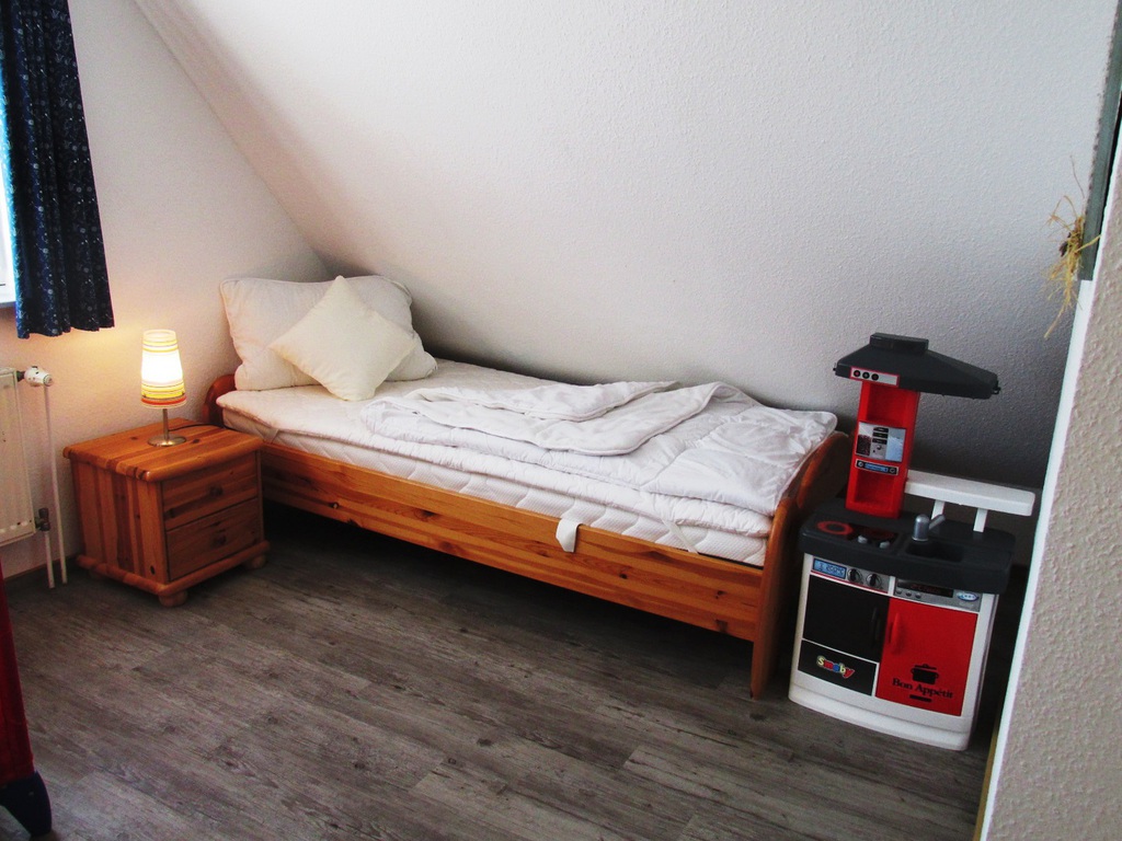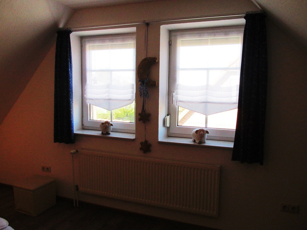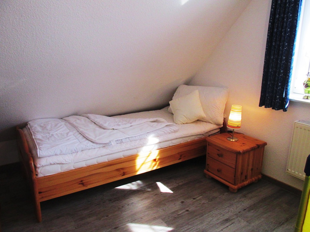 Im Obergeschoss erwarten Sie zwei weitere Schlafzimmer – eines mit Doppelbett und TV sowie eines mit zwei Einzelbetten und Kinderspielzeug – sowie ein zweites Badezimmer mit Dusche/WC. Damit bietet das Wattperlchen auch größeren Familien ausreichend Platz.