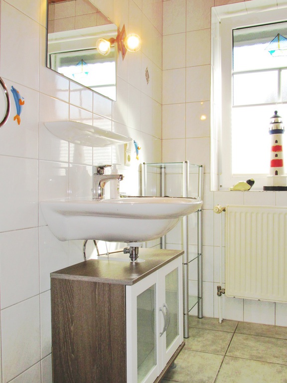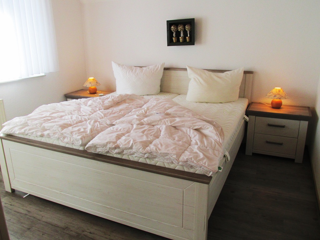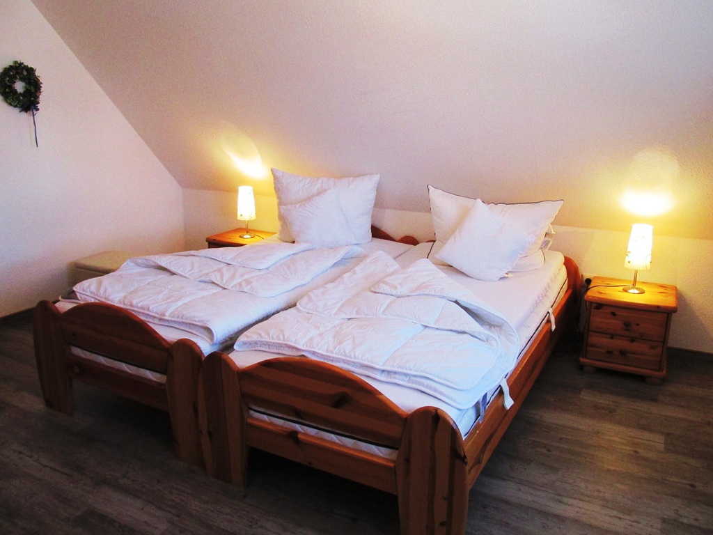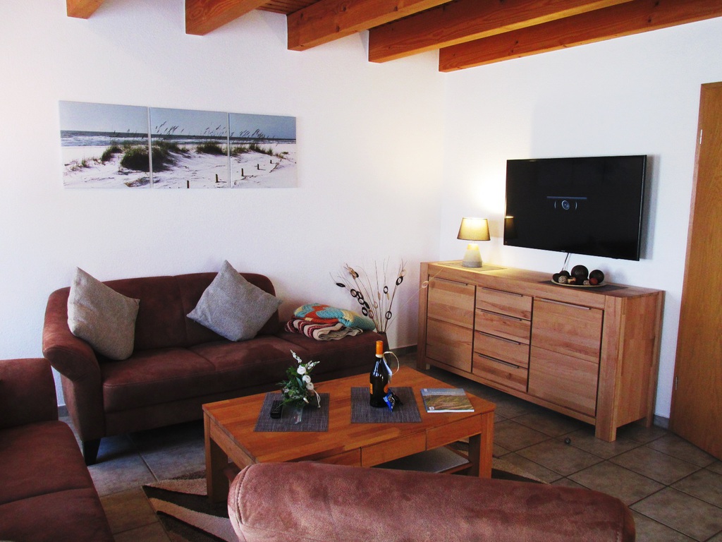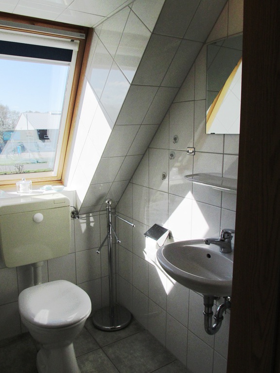 Im Obergeschoss erwarten Sie zwei weitere Schlafzimmer – eines mit Doppelbett und TV sowie eines mit zwei Einzelbetten und Kinderspielzeug – sowie ein zweites Badezimmer mit Dusche/WC. Damit bietet das Wattperlchen auch größeren Familien ausreichend Platz.
