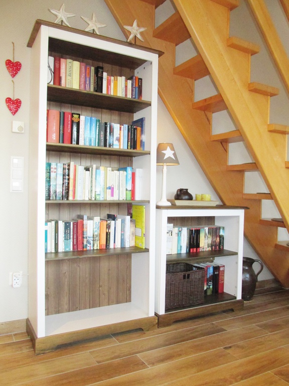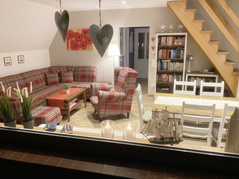 Direkt nebenan befindet sich der Vorratsraum mit Waschmaschine, Mikrowelle und weiteren Küchengeräten. Auch ein Hochstuhl für die kleinen Gäste steht bereit. Der kombinierte Wohn- und Essbereich ist ein weiteres Highlight: Ein großer Esstisch mit Blick in den Garten, eine gemütliche Couch mit Sessel, dazu ein TV mit DVD-Player und eine umfangreiche Büchersammlung – perfekt für Filmabende, Spiele oder zum Schmökern. Große Fenster lassen viel Licht herein und der Zugang zur Terrasse macht den Wohnbereich zum Herzstück des Hauses. Für zusätzlichen Komfort sorgen die elektrischen Jalousien im Erdgeschoss.