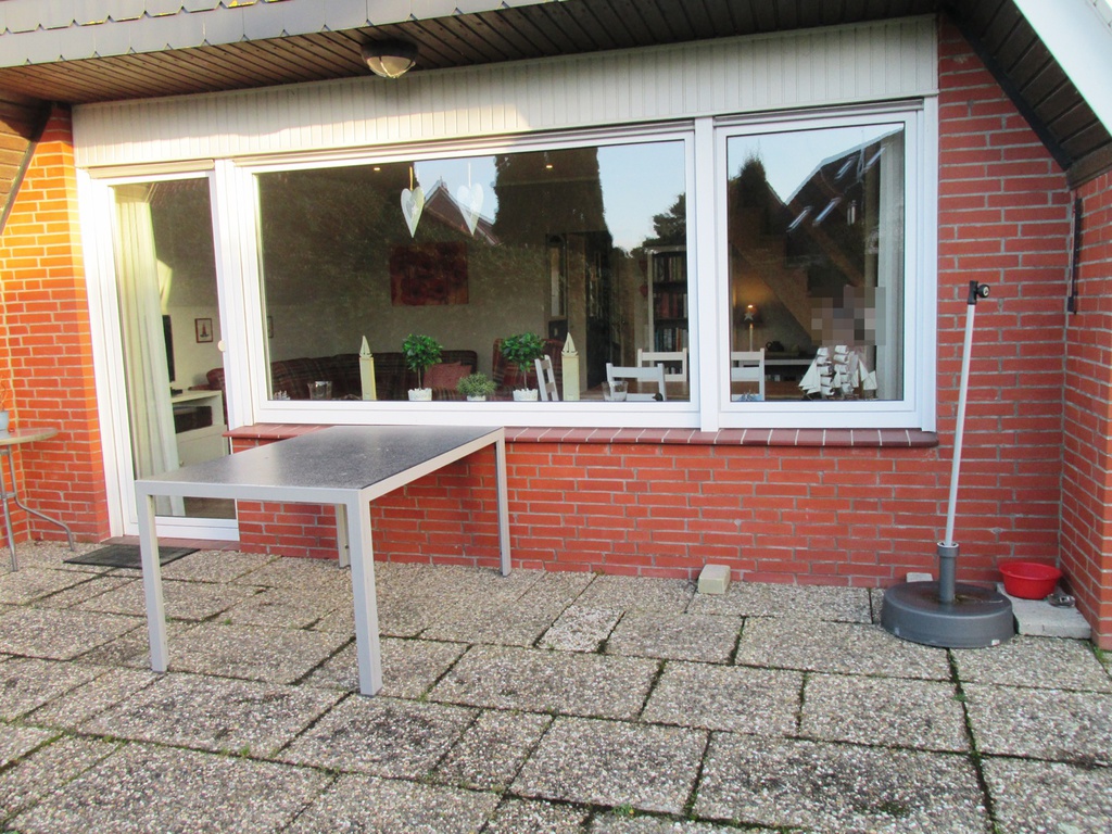 Der Außenbereich lädt mit einer Terrasse und Gartenmöbeln zum Entspannen ein. WLAN ist selbstverständlich vorhanden.